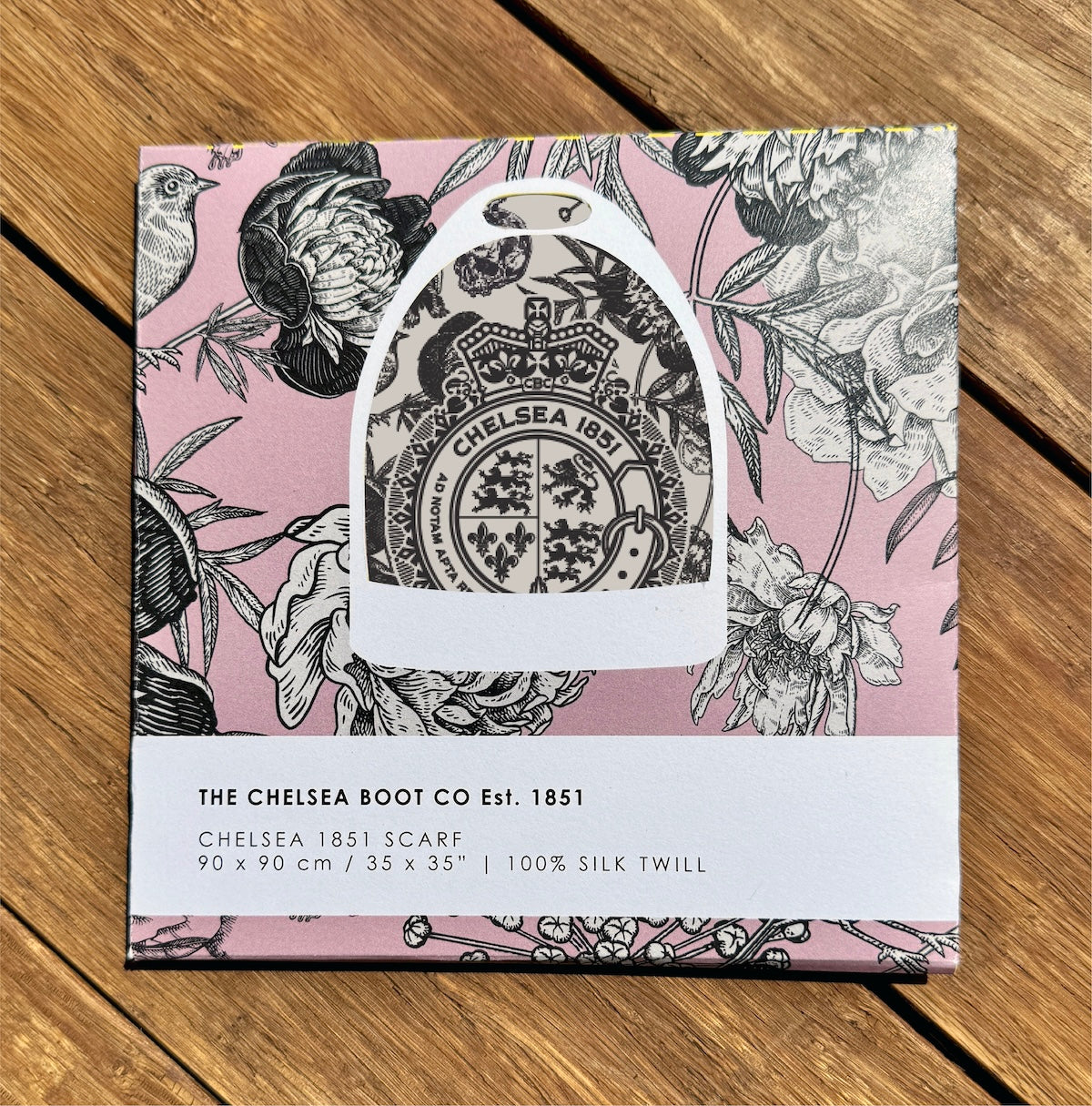At its heart lies the Chelsea Boot Co. Est. 1851 crest, flanked by exquisitely hand-drawn blooms, feathers, butterflies, and birds, all intricately composed in archival black line drawing. Look closer and you'll find a signature detail: a small gold- or silver-toned metal skull charm stitched into one corner—an exclusive design marker of our Rock & Royal identity.