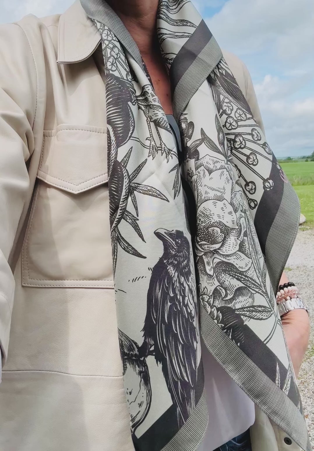 Step into a legacy of craftsmanship with this exquisitely designed 100% silk twill scarf, measuring a generous 90x90 cm (35x35”). The design draws inspiration from the Victorian botanical and heraldic archives, blending classic British elegance with the rebellious spirit of rock and roll. In a sophisticated light taupe-grey and black palette, this scarf pays tribute to heritage, being both refined and edgy.